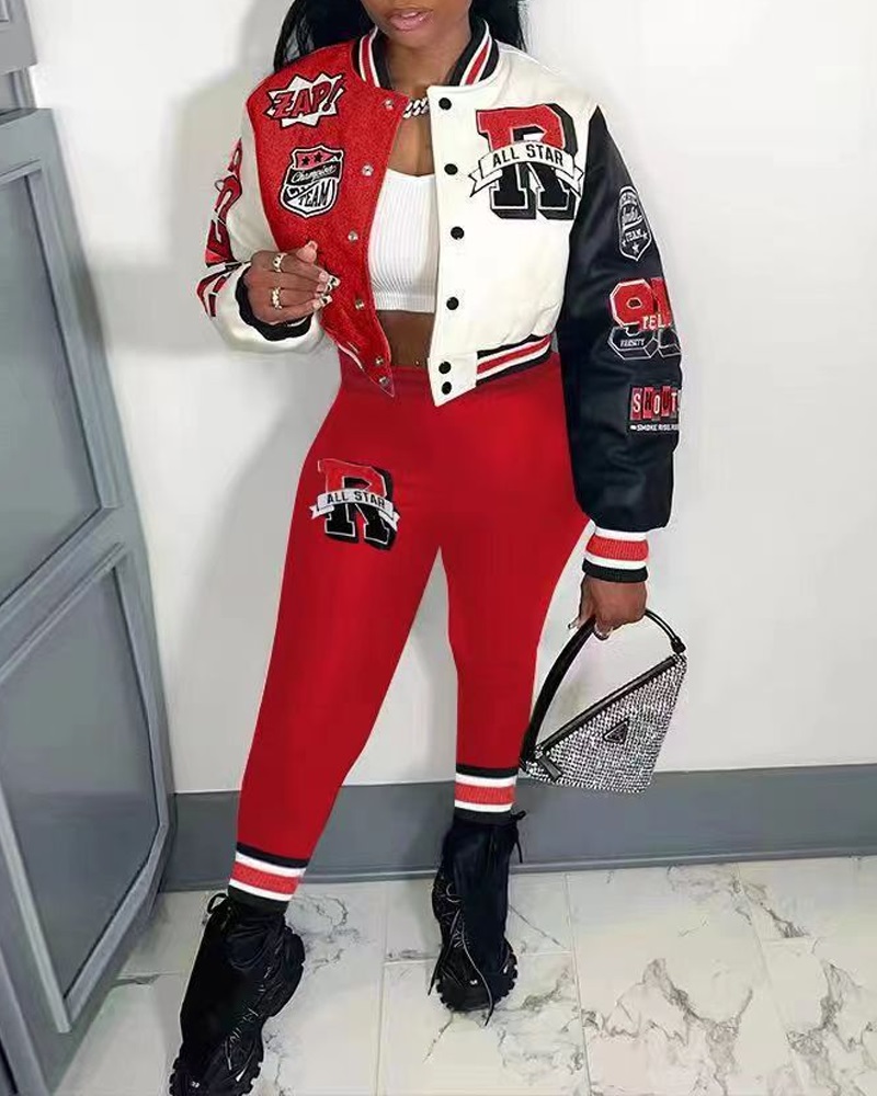 Colorblock Graphic Print Baseball Jacket & Pants Set