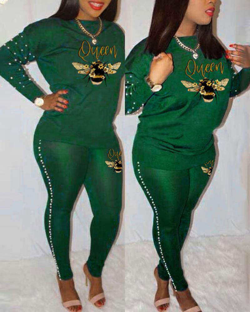 Bee Letter Print Beaded Decor Casual Top & Pants Set