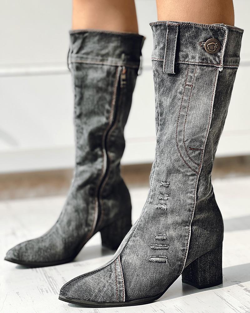 Style:Chic Type:Boots Material:Denim Pattern Type:Contrast Paneled Decoration:Button,Ripped Occasion:Daily Toe:Point Toe Heel Height:Low Heel Package Include:1*Boots