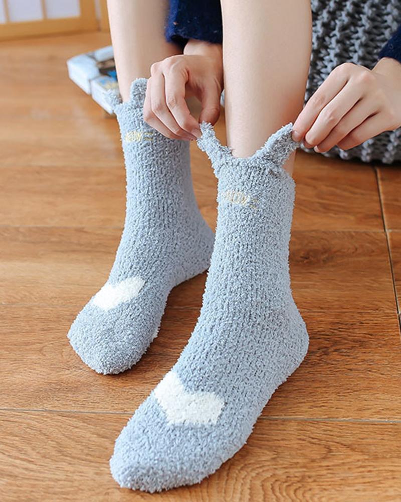 1Pair Bear Ears Heart Pattern Fuzzy Thermal Socks