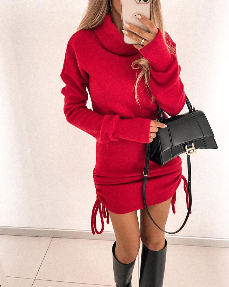 Drawstring Ruched Turtleneck Long Sleeve Dress