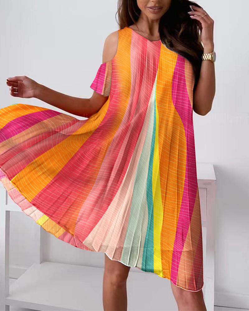 Style:Casual Type:Pleated,Smock Material:100%Polyester Neckline:Cold Shoulder Sleeve Style:Short Sleeve Length:Mini Pattern Type:Colorblock Fit Type:Oversized Occasion:Daily,Vacation Package Include:1* Dress
