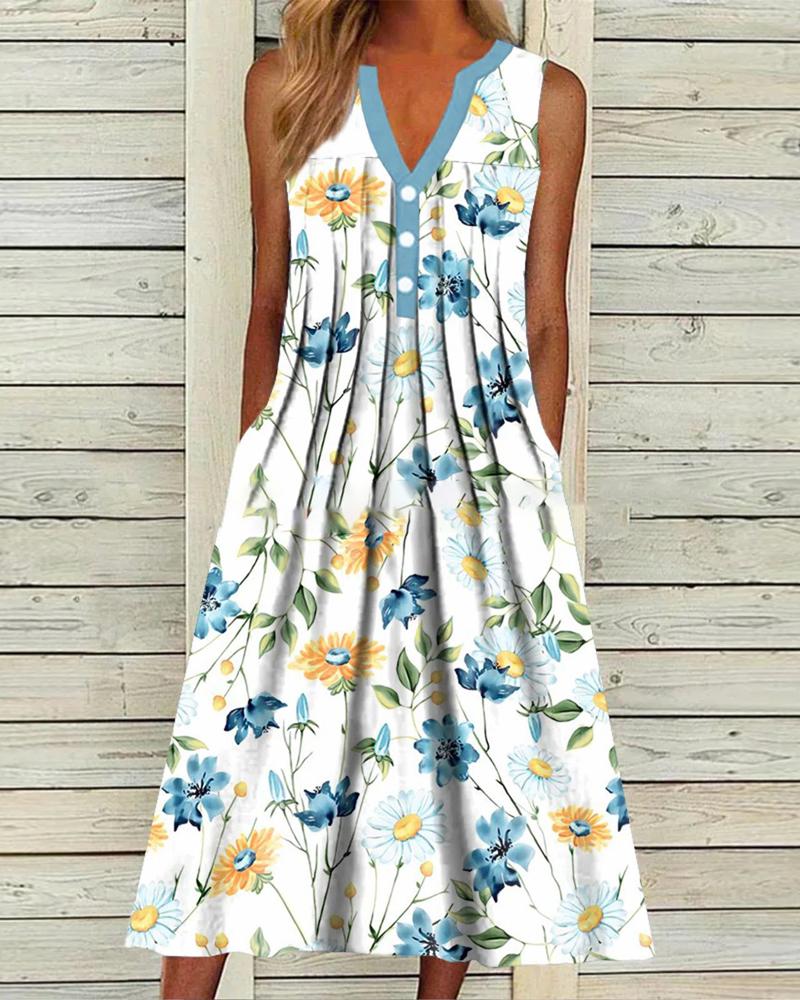 Style:Basics,Casual Type:Flared,Pleated Material:Polyester Neckline:V-Cut Sleeve Style:Sleeveless Length:Mid-Calf Pattern Type:Floral Decoration:Button,Pocket Fit Type:Oversized Occasion:Daily,Vacation Package Include:1* Dress