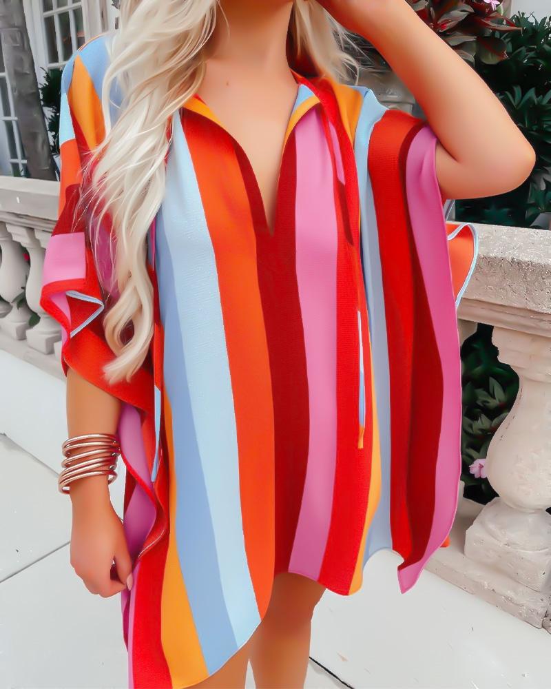 Style:Chic,Casual Type:Shirt Material:Polyester Neckline:V-Cut Sleeve Style:Three Quarters Length:Regular Pattern Type:Colorblock,Striped Decoration:Slit Fit Type:Oversized Occasion:Daily,Vacation Package Include:1*Shirt