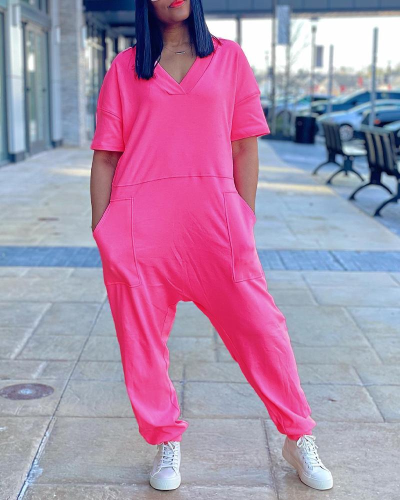 Style:Basics,Casual Type:Jumpsuit Material:Polyester Neckline:V-Neck Sleeve Style:Short Sleeve Length:Long Pattern Type:Plain Decoration:Pocket Fit Type:Regular Occasion:Daily Package Include:1*Jumpsuit