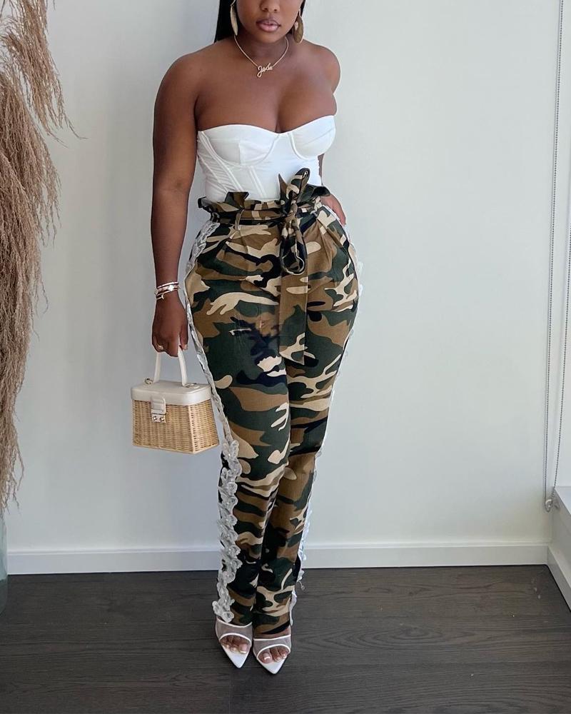 Style:Casual,Chic Type:Pants Material:Polyester Length:Long Pattern Type:Camouflage Decoration:Contrast Lace,Pocket Fit Type:Regular With Belt:Yes Occasion:Daily Package Include:1*Pants (With Belt)