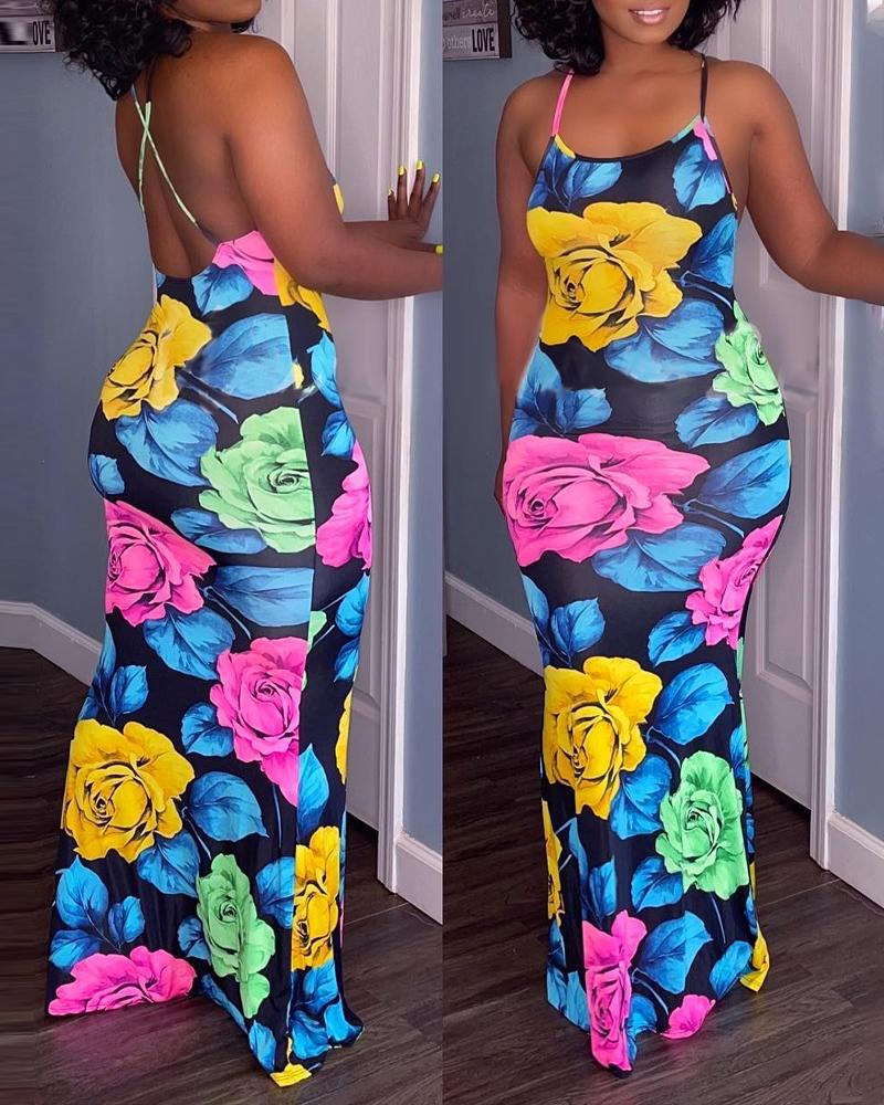 Style:Chic,Sexy Type:Straight Material:Polyester Neckline:Low Cut Sleeve Style:Spaghetti Strap Length:Maxi Pattern Type:Floral Decoration:Backless,Criss Cross Fit Type:Regular Occasion:Daily,Vacation Package Include:1* Dress