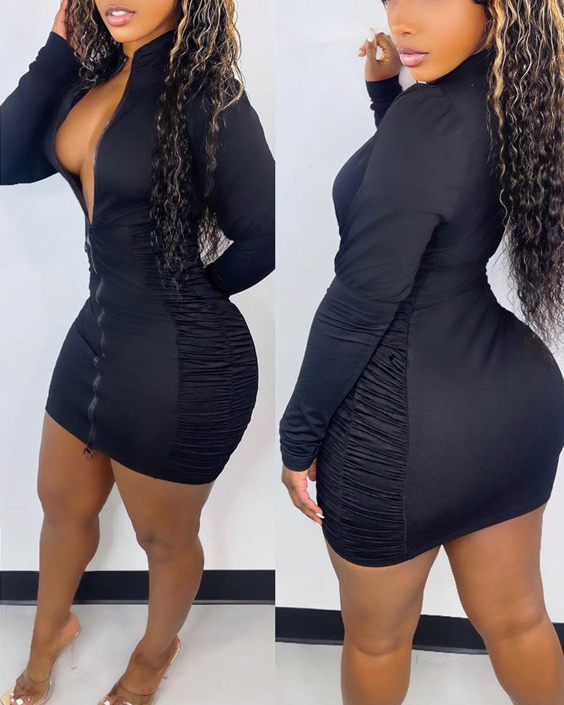 Style:Chic,Sexy Type:Bodycon Material:Polyester Neckline:Mock Neck Sleeve Style:Long Sleeve Length:Mini Pattern Type:Plain Decoration:Ruched,Zipper Fit Type:Skinny Occasion:Daily Package Include:1* Dress
