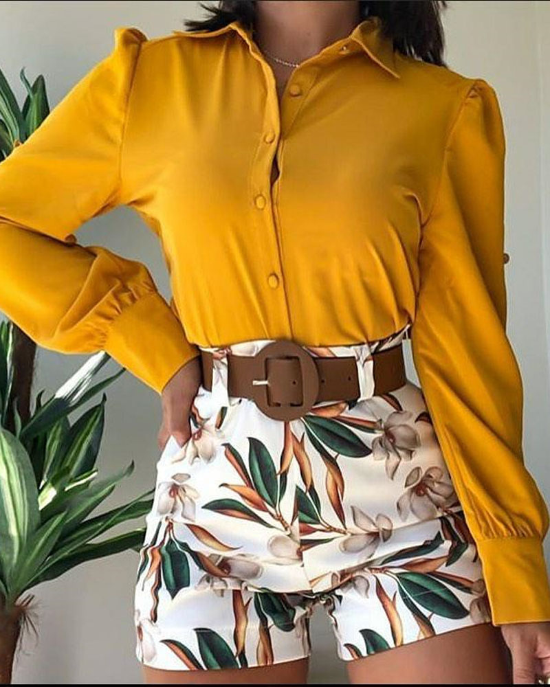 Style:Casual,Chic Type:Shorts Set Material:Polyester Neckline:Turn-down Collar Sleeve Style:Long Sleeve Length:Above Knee Pattern Type:Floral,Plants Decoration:Button Fit Type:Regular With Belt:Yes Occasion:Daily,Vacation Package Include:1*Shorts Set (With Belt)