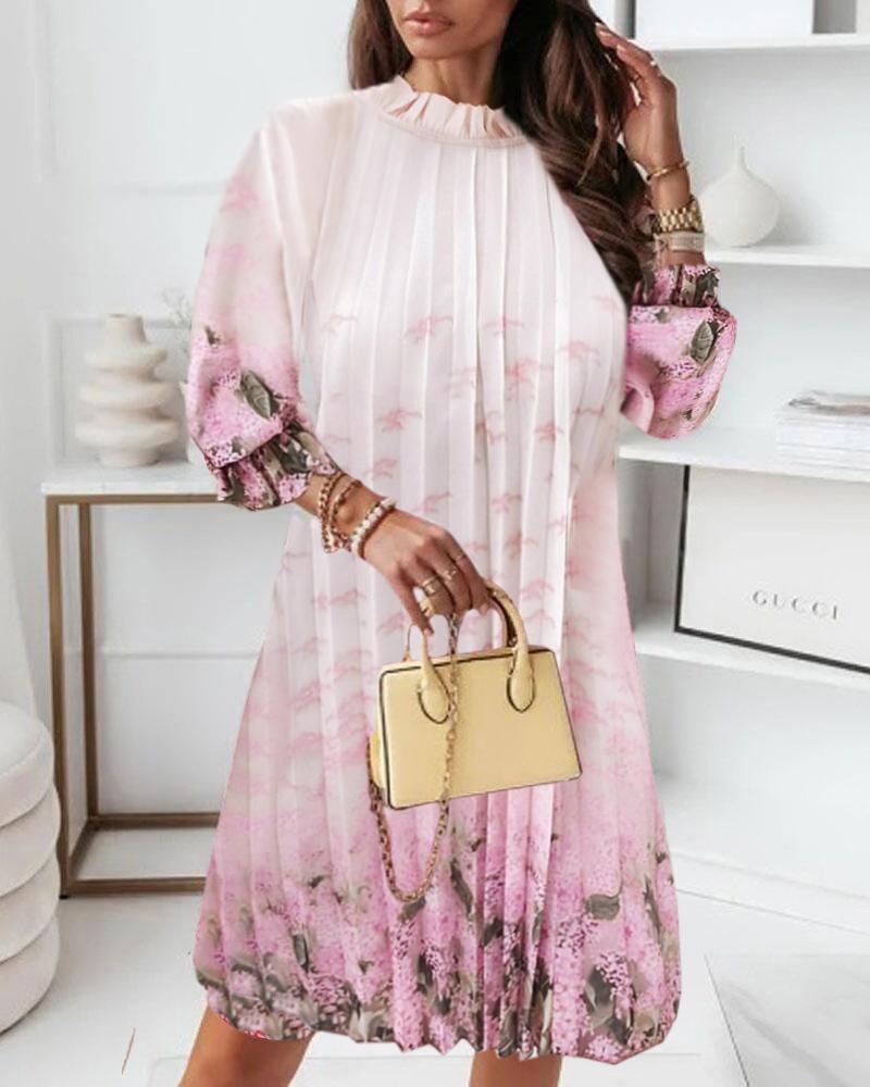 Floral Leaf Print Frill Hem Pleated Dress