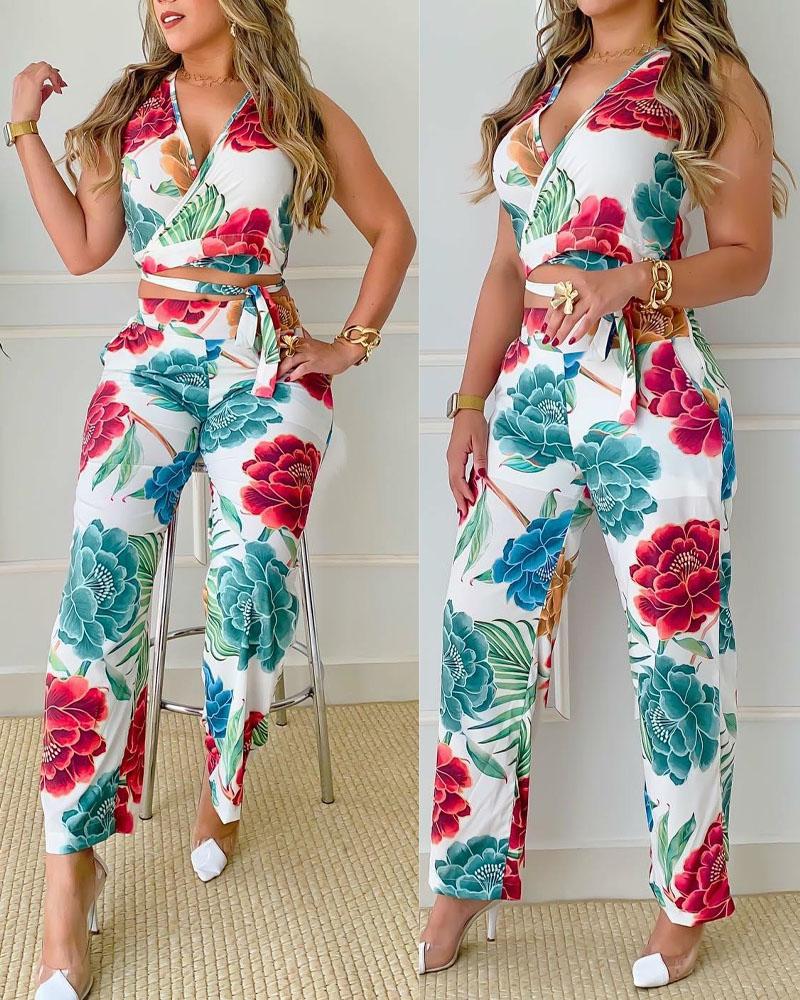 Style:Casual,Chic Type:Pants Sets Material:Polyester Neckline:V-Neck Sleeve Style:Sleeveless Length:Long Pattern Type:Floral Decoration:Tied Detail Fit Type:Regular Occasion:Daily Package Include:1*Pants Set