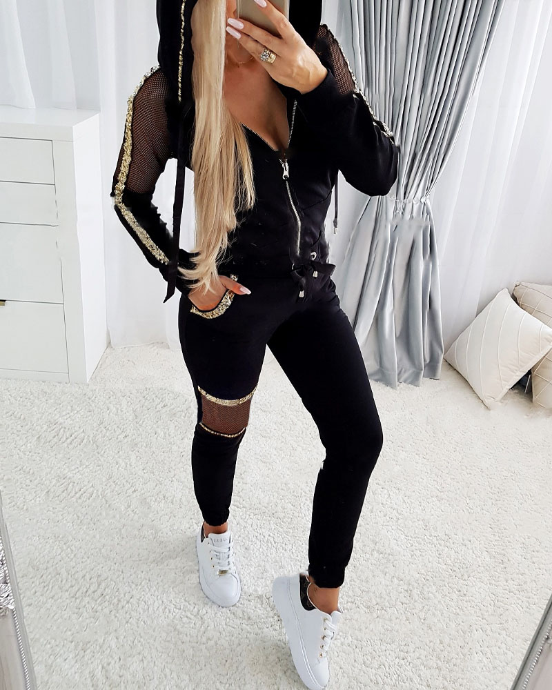 Contrast Sequin Fishnet Patch Zip Up Hooded Top & Pants Set