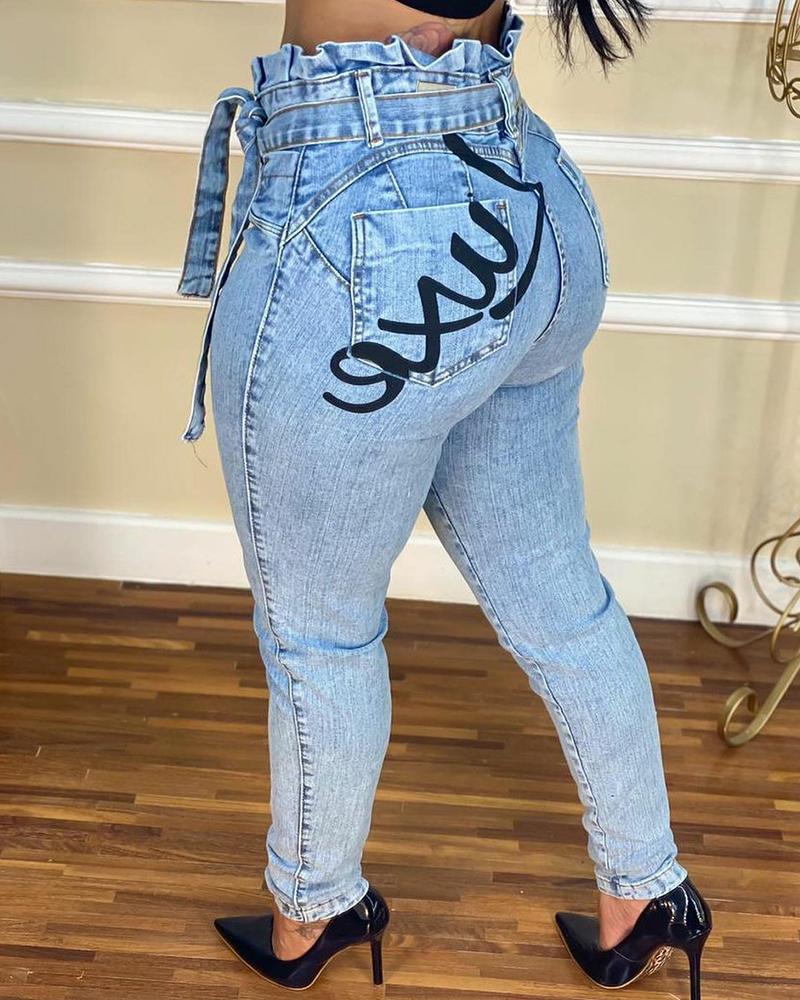 Letter Print Frill Hem Belted Skinny Jeans