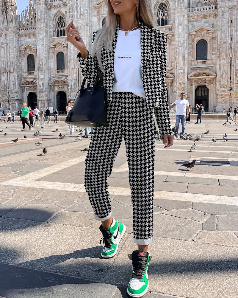 Houndstooth Print Blazer Coat & High Waist Pants Set