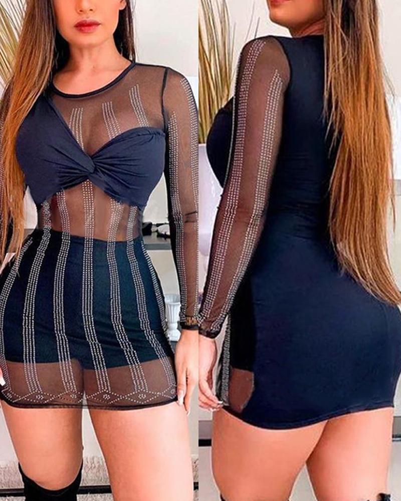 Rhinestone Contrast Mesh Long Sleeve Bodycon Dress
