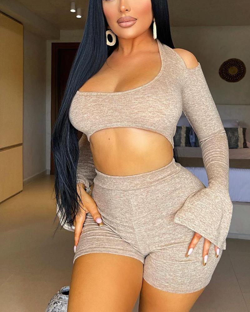 Style:Chic Type:Shorts Set Material:Polyester Neckline:Halter Sleeve Style:Long Sleeve,Bell Sleeve Length:Above Knee Pattern Type:Plain Fit Type:Skinny Occasion:Daily Package Include:Shorts Set