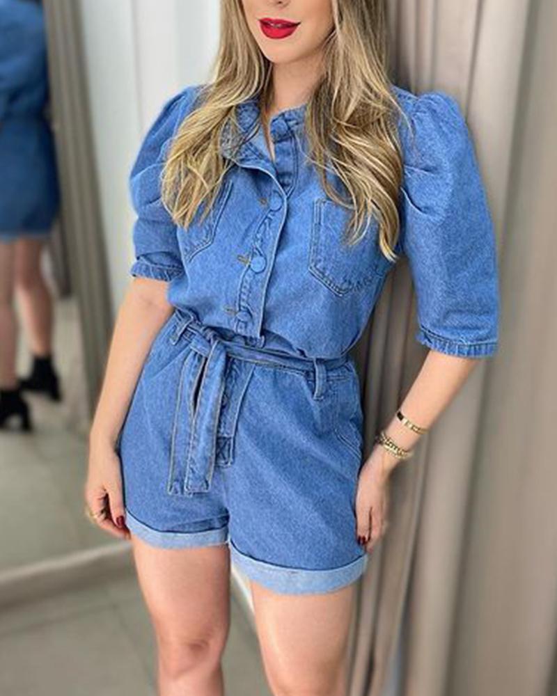 Style:Chic,Denim Type:Denim Overall & Jumpsuits Material:Denim Neckline:O-neck Sleeve Style:Puff Sleeve,Half Sleeve Length:Above Knee Pattern Type:Plain Decoration:Button,Pocket,Puff Sleeve Fit Type:Regular With Belt:Yes Occasion:Daily Package Include:1*Romper (With Belt)