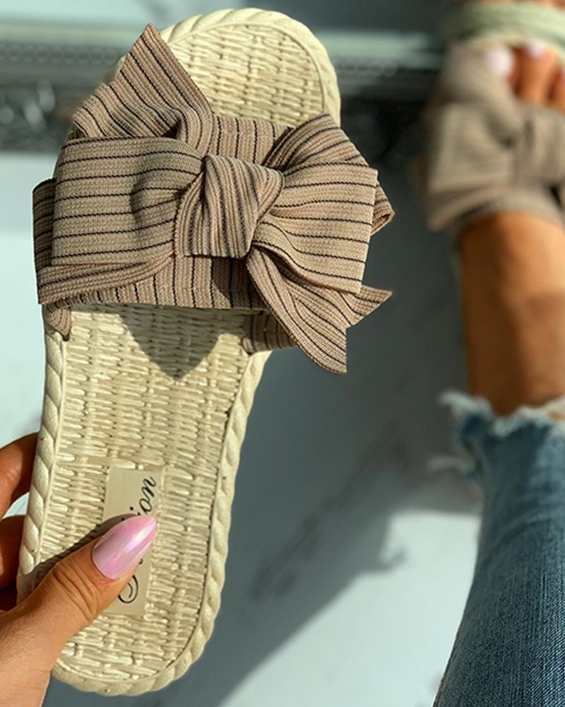 Striped Bowknot Decor Woven Flax Flat Sandals