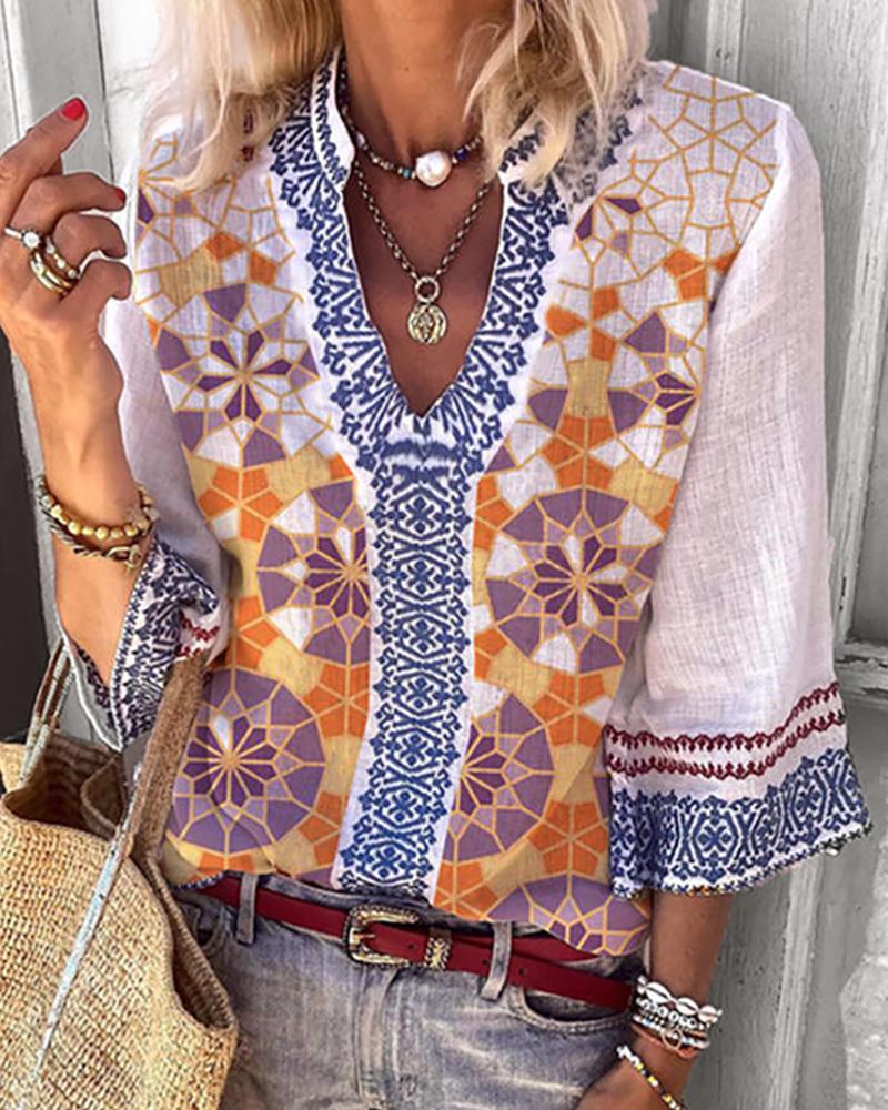 Style:Chic Type:Blouses Material:Polyester Neckline:V-Neck Sleeve Style:Bell Sleeve Length:Regular Pattern Type:Geometric Fit Type:Regular Occasion:Daily Package Include:1* Blouse