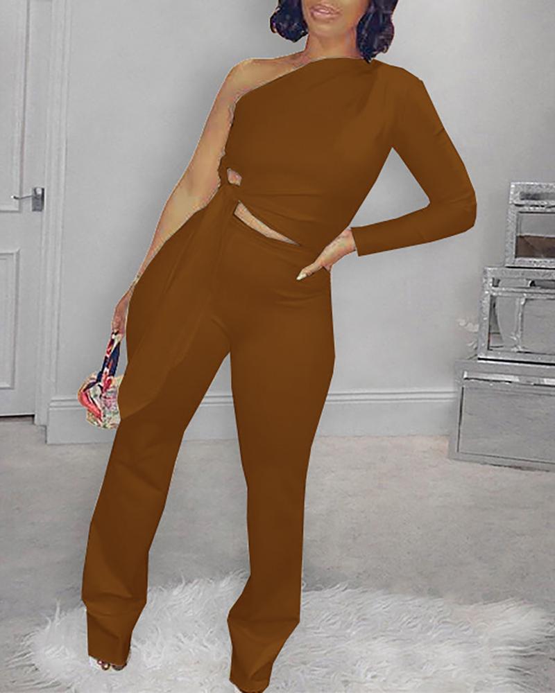 Style:Basics Type:Pants Sets Material:Polyester Neckline:One Shoulder Sleeve Style:Long Sleeve Length:Long Pattern Type:Plain Decoration:Tied Detail Fit Type:Regular Occasion:Daily Package Include:Pants Sets