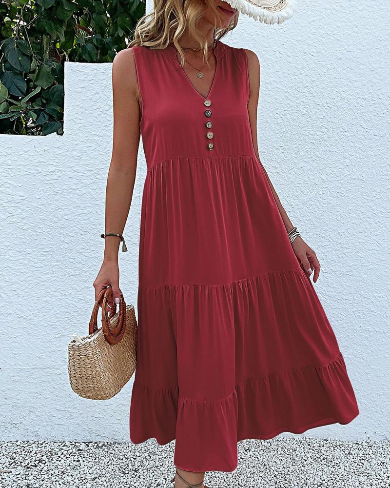 Style:Chic,Casual Type:Smock Material:Polyester Neckline:Stand Collar,Notch Neck Sleeve Style:Sleeveless Length:Mid-Calf Pattern Type:Plain Decoration:Button,Ruched Fit Type:Regular Occasion:Daily Package Include:1* Dress Fabric Elasticity:Slight Stretch Sheer:No Care Instructions:Machine wash or professional dry clean