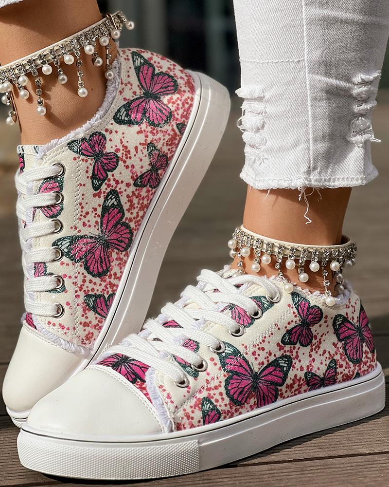 Butterfly Embroidery Raw Hem Lace-up Sneakers