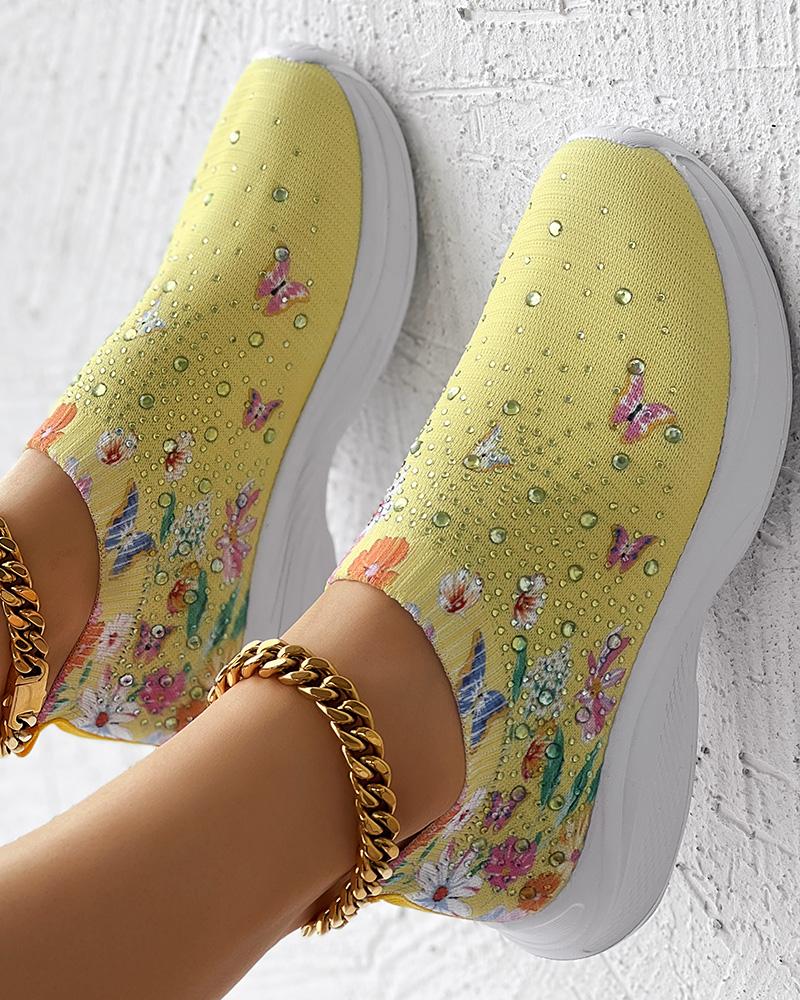 Floral Butterfly Waterdrop Print Breathable Slip-On Sneakers
