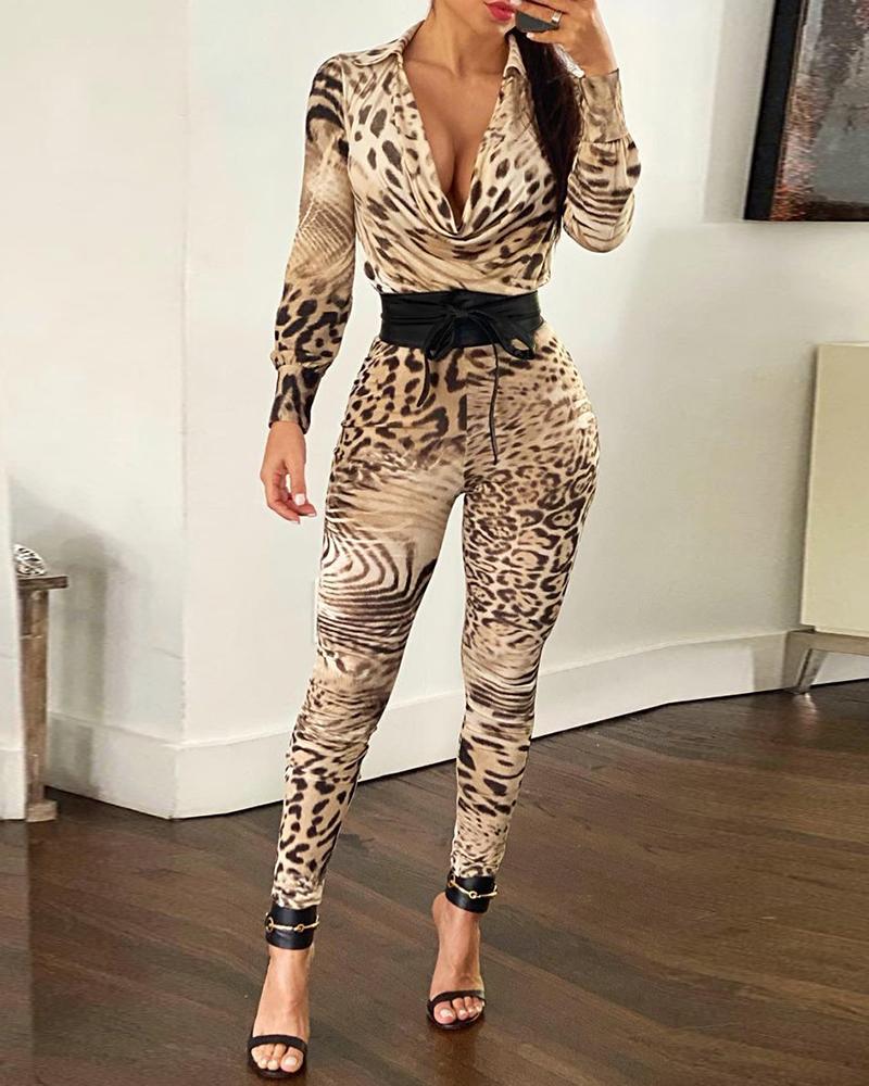 Style:Sexy Type:Jumpsuit Material:Polyester Neckline:Cowl Neck Sleeve Style:Long Sleeve Length:Long Pattern Type:Animal Fit Type:Skinny With Belt:Yes Occasion:Daily Package Include:1*Jumpsuit