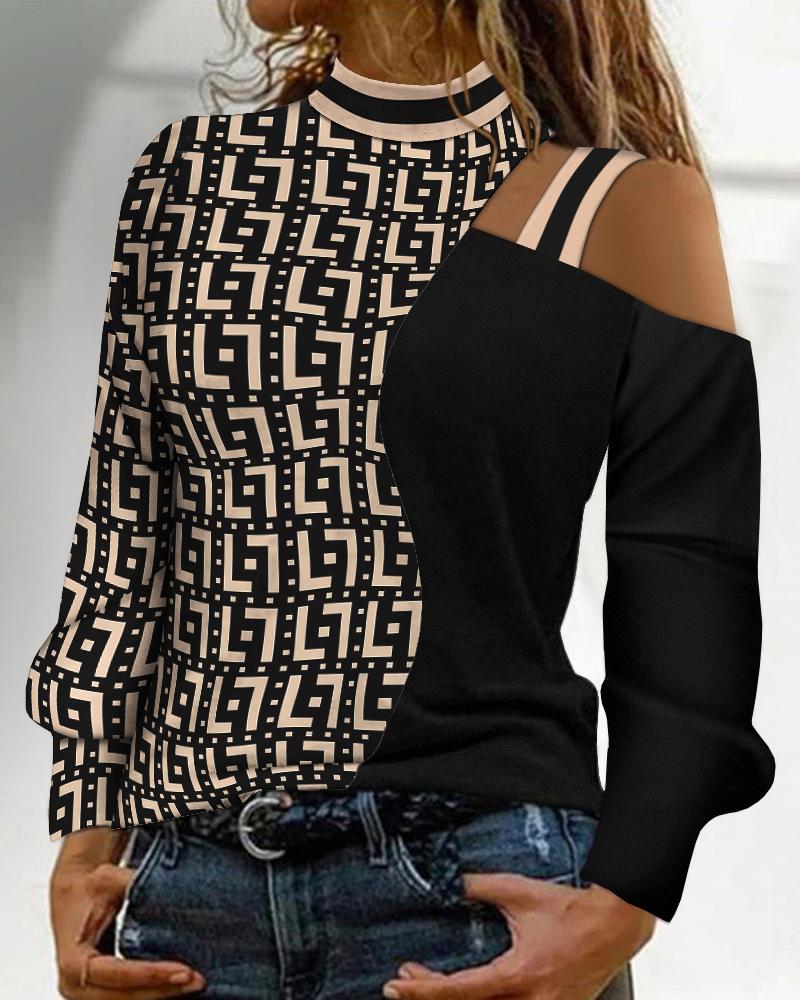 Style:Casual Type:Tee Material:Polyester Neckline:Cold Shoulder Sleeve Style:Long Sleeve Length:Regular Pattern Type:Geometric Fit Type:Regular Occasion:Daily Package Include:1*Top