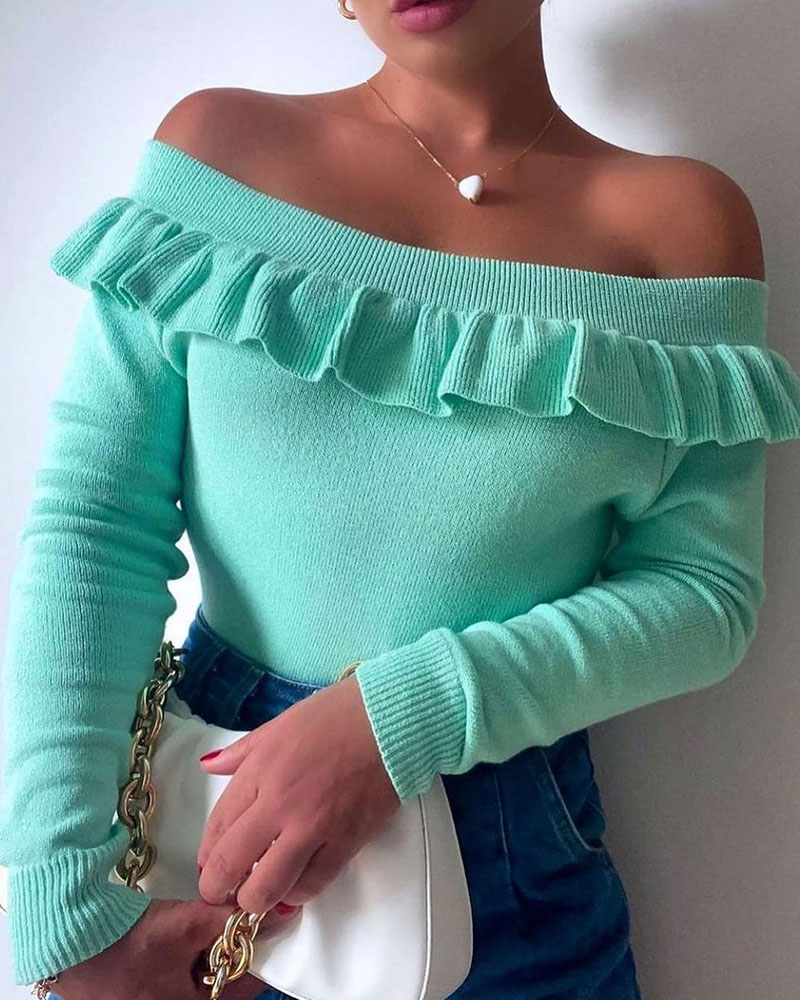 Eyelet Lace-up Drop Shoulder Ruffles Sweater