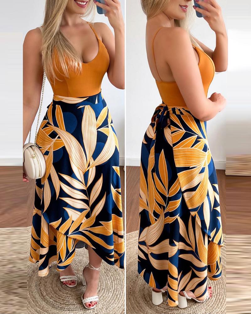 Style:Casual Type:Skirt Sets Material:Polyester Neckline:V-Neck Sleeve Style:Spaghetti Strap Length:Maxi Pattern Type:Tropical Decoration:Tied Detail Fit Type:Regular Occasion:Daily,Vacation Package Include:1*Skirt Set