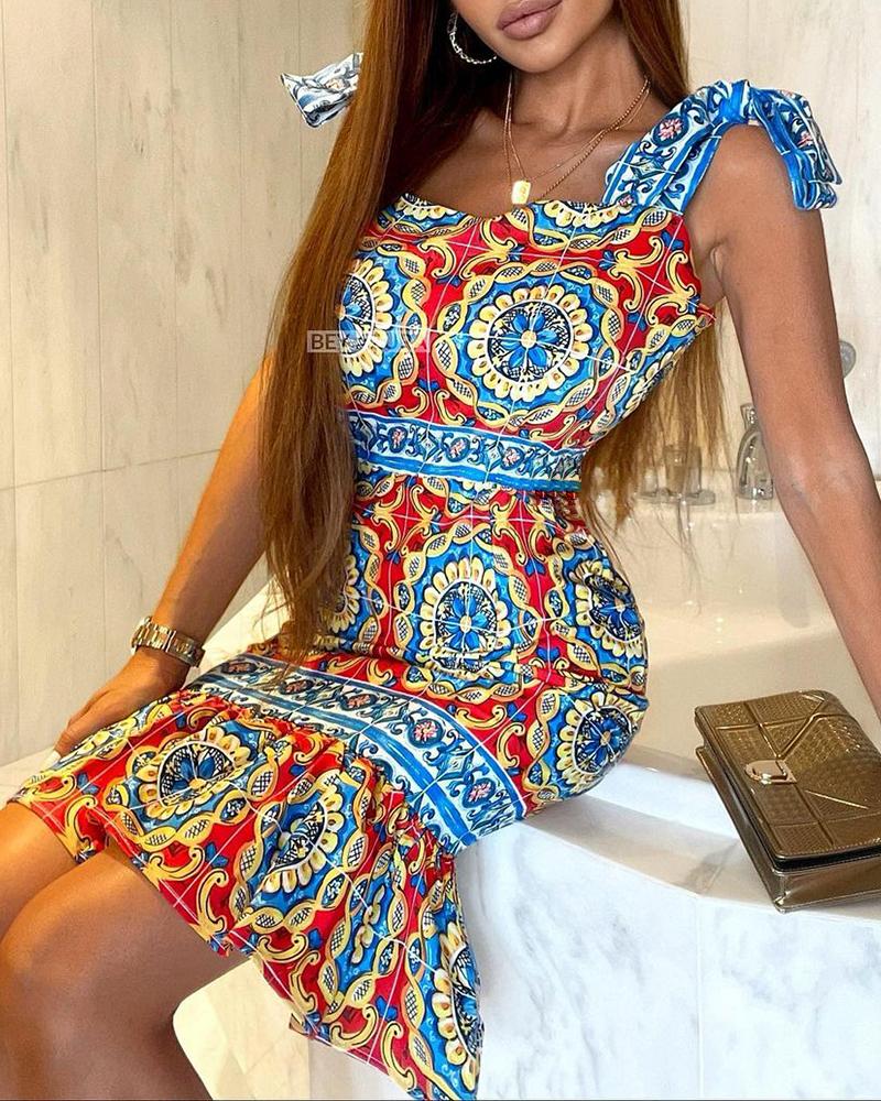 Style:Chic Type:Mermaid Material:Polyester Neckline:Square Neck Sleeve Style:Sleeveless Length:Mini Pattern Type:Graphic Decoration:Random Print Fit Type:Regular Occasion:Daily Package Include:1* Dress