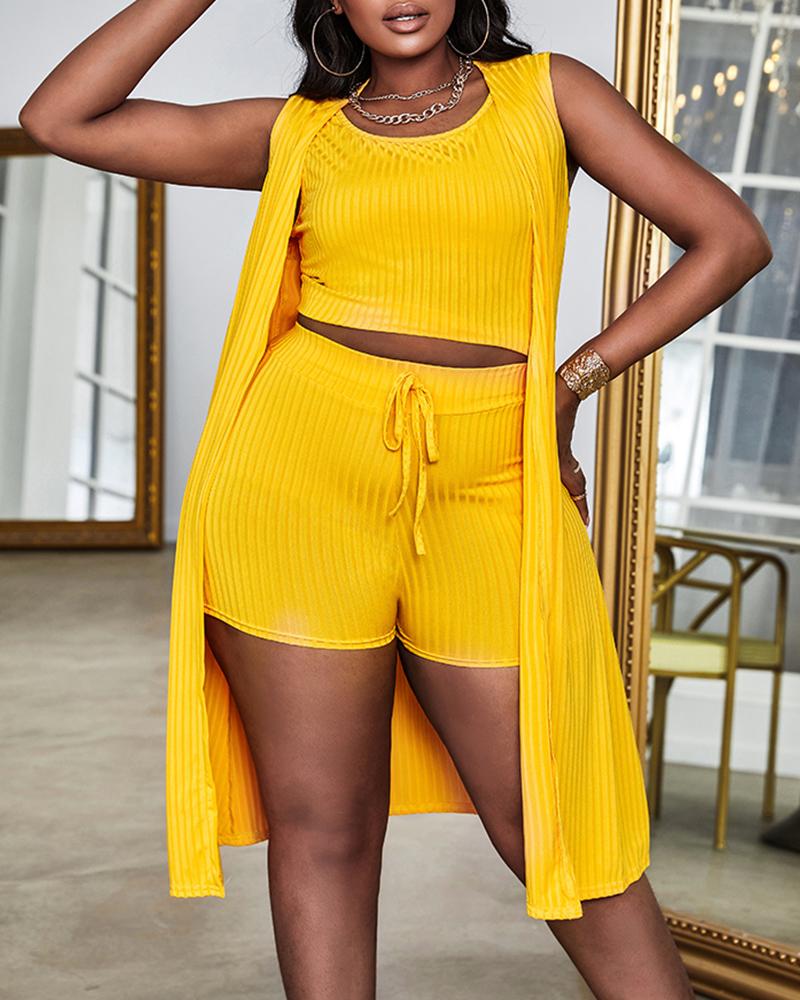 3PCS Ribbed Crop Tank Top & Shorts Set With Vest Coat