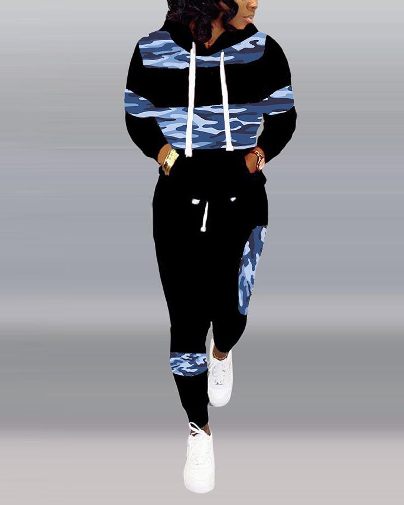 Style:Casual,Sporty Type:Sweatpants Sets,Sweatshirt Sets Material:95%Polyester,5%Elastane Neckline:Hooded Sleeve Style:Long Sleeve Length:Long Pattern Type:Camouflage Decoration:Drawstring,Pocket Fit Type:Regular Occasion:Daily Package Include:1*Pants Set Fabric Elasticity:Non-Stretch