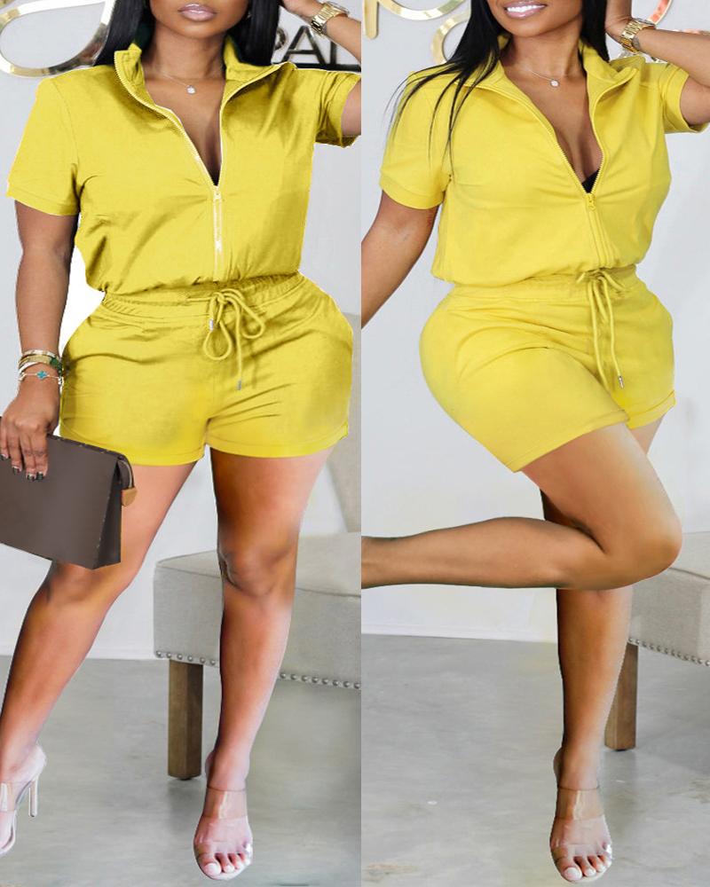 Style:Casual Type:Shorts Set Material:Polyester Neckline:Turn-down Collar Sleeve Style:Short Sleeve Length:Above Knee Pattern Type:Plain Decoration:Drawstring,Pocket,Zipper Fit Type:Regular Occasion:Daily Package Include:1*Shorts Set