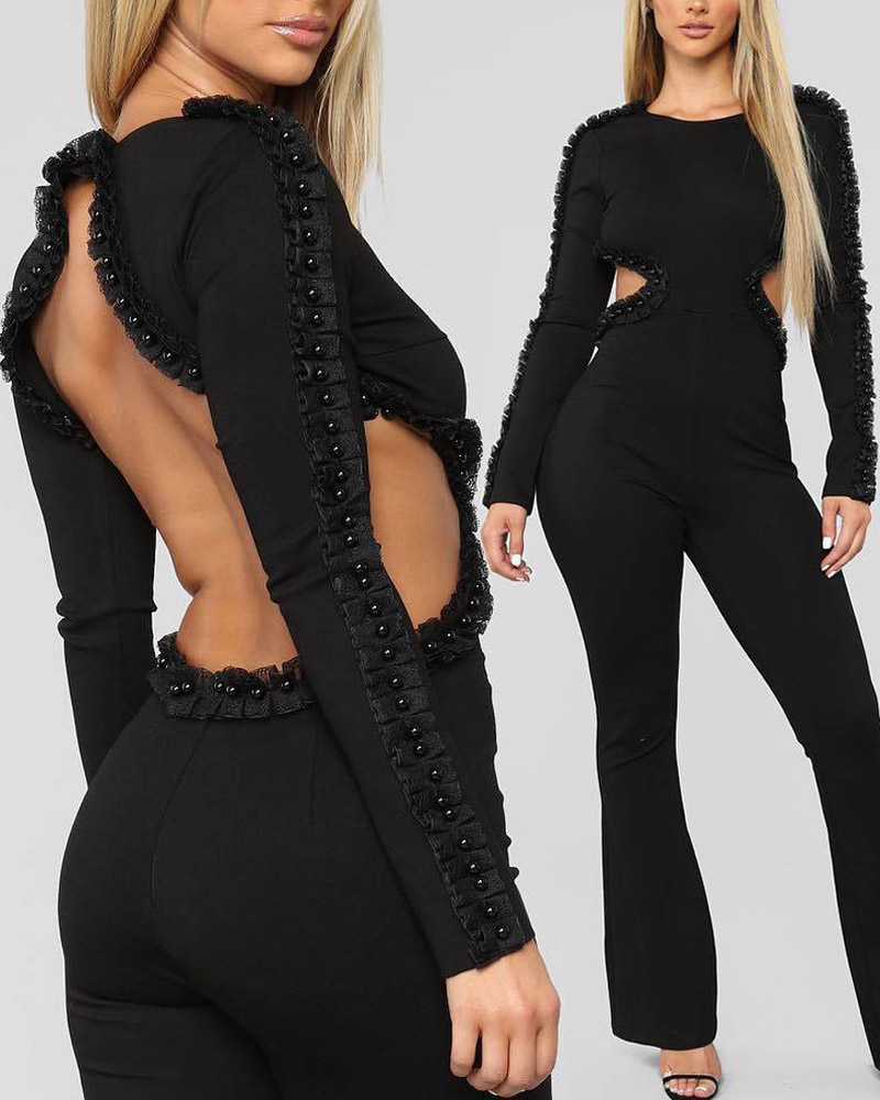 Style:Sexy Type:Jumpsuit Material:Polyester Neckline:Round Neck Sleeve Style:Long Sleeve Length:Long Pattern Type:Plain Decoration:Beaded,Backless Fit Type:Regular Occasion:Daily Package Include:1*Jumpsuit
