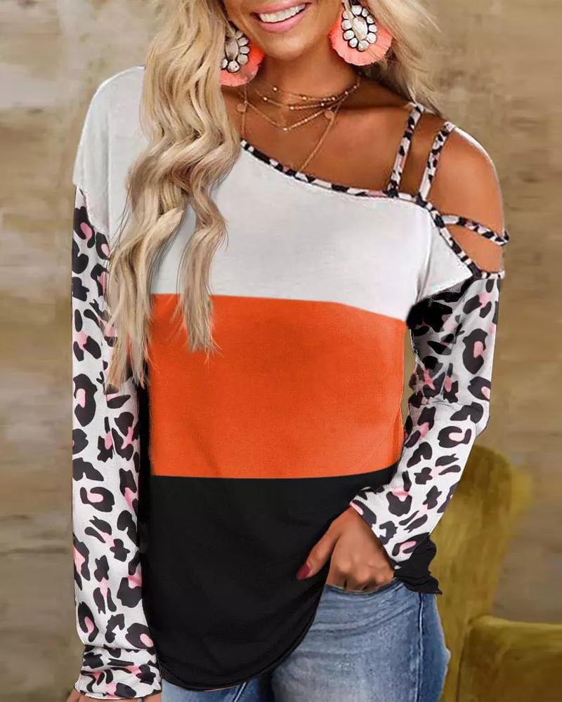 Style:Casual Type:Tee Material:Polyester Neckline:Cold Shoulder Sleeve Style:Long Sleeve Length:Regular Pattern Type:Colorblock,Leopard Fit Type:Regular Occasion:Daily Package Include:1*Top