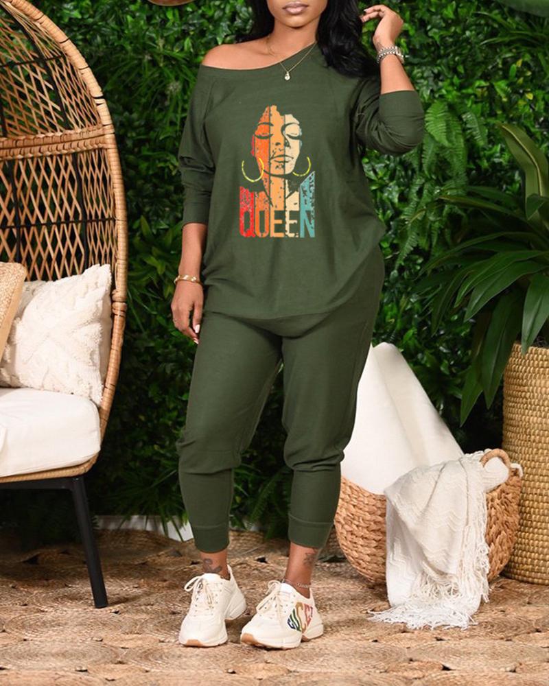 Figure Print Long Sleeve Casual Top & Pants Set