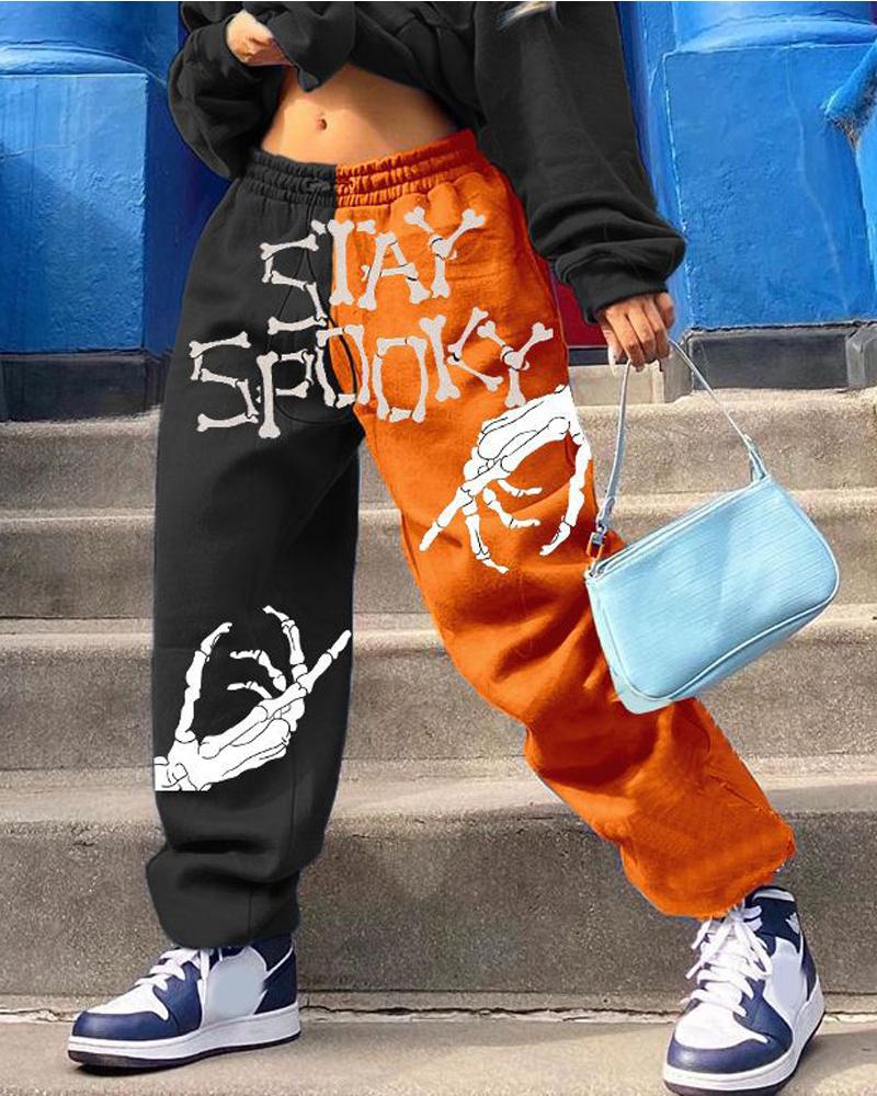Halloween Skeleton Print Colorblock Sweatpants