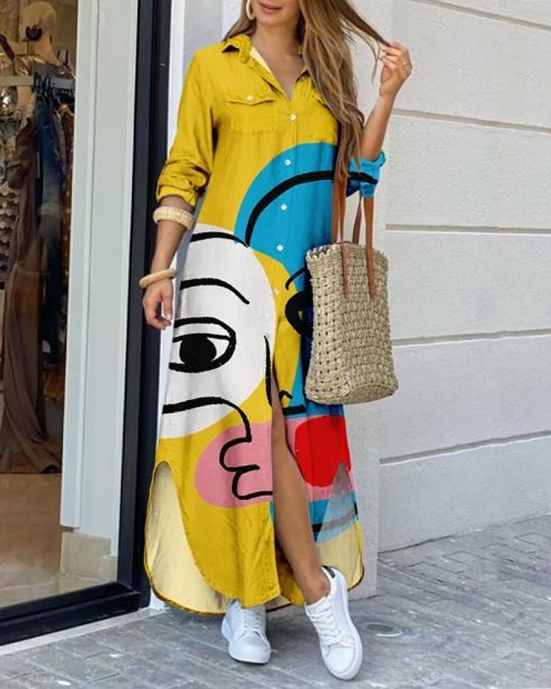 Style:Casual Type:Shirt Material:Polyester Neckline:Turn-down Collar Sleeve Style:Long Sleeve,Roll Up Sleeve Length:Maxi Pattern Type:Abstract,Figure Decoration:Button,Pocket Fit Type:Regular Occasion:Daily Package Include:1* Dress