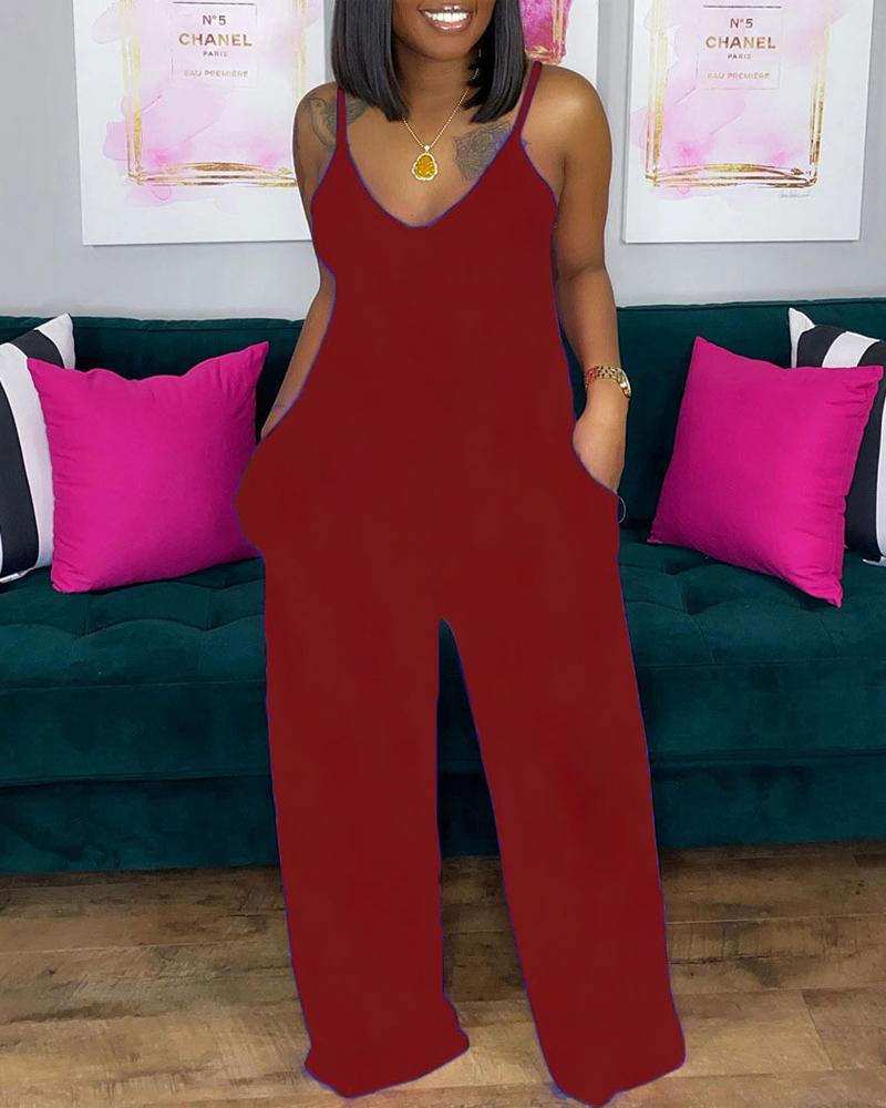 Style:Chic,Casual Type:Jumpsuit Material:Polyester Neckline:V-Neck Sleeve Style:Spaghetti Strap Length:Long Pattern Type:Plain Decoration:Pocket Fit Type:Oversized Occasion:Daily Package Include:1*Jumpsuit