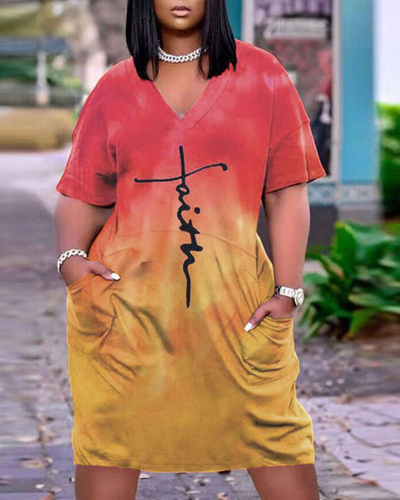 Style:Basics,Casual Type:Straight,Tee Material:Polyester Neckline:V-Neck Sleeve Style:Short Sleeve Length:Midi Pattern Type:Letter,Ombre,Tie Dye Decoration:Pocket Fit Type:Oversized Occasion:Daily Package Include:1* Dress