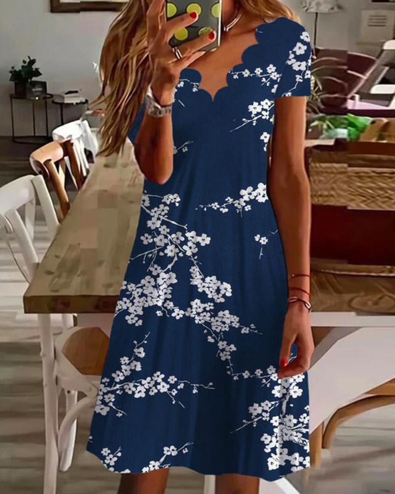 Style:Casual,Chic Type:A Line Material:Polyester Neckline:V-Neck Sleeve Style:Short Sleeve Length:Mini Pattern Type:Floral Decoration:Scallop Fit Type:Regular Occasion:Daily,Vacation Package Include:1* Dress