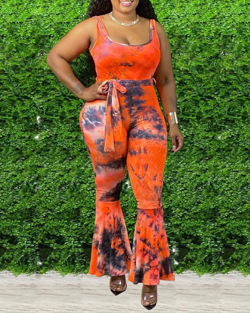Style:Casual,Chic Type:Flared,Jumpsuit Material:Polyester Neckline:U-Neck Sleeve Style:Sleeveless Length:Long Pattern Type:Tie Dye Fit Type:Skinny With Belt:Yes Occasion:Daily Package Include:1*Jumpsuit (With Belt)