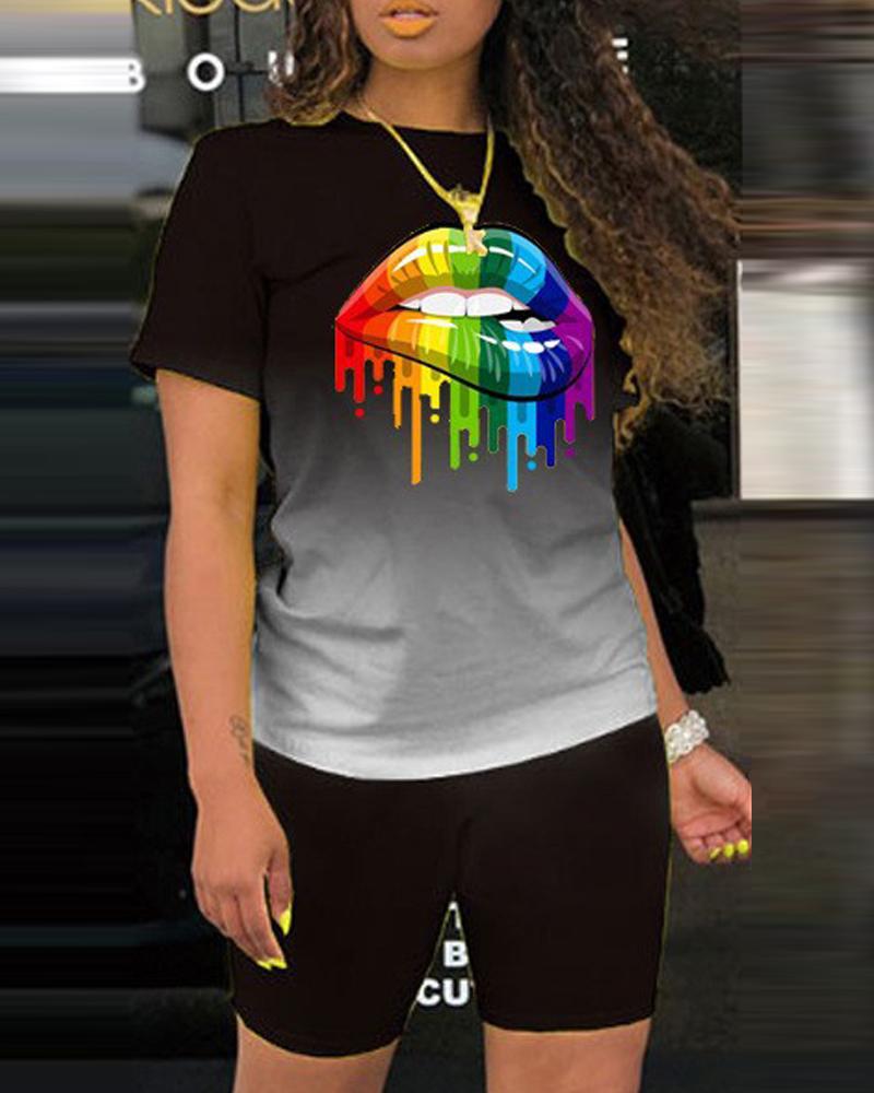 Plus Size Lip Print Ombre Casual Top & Shorts Set