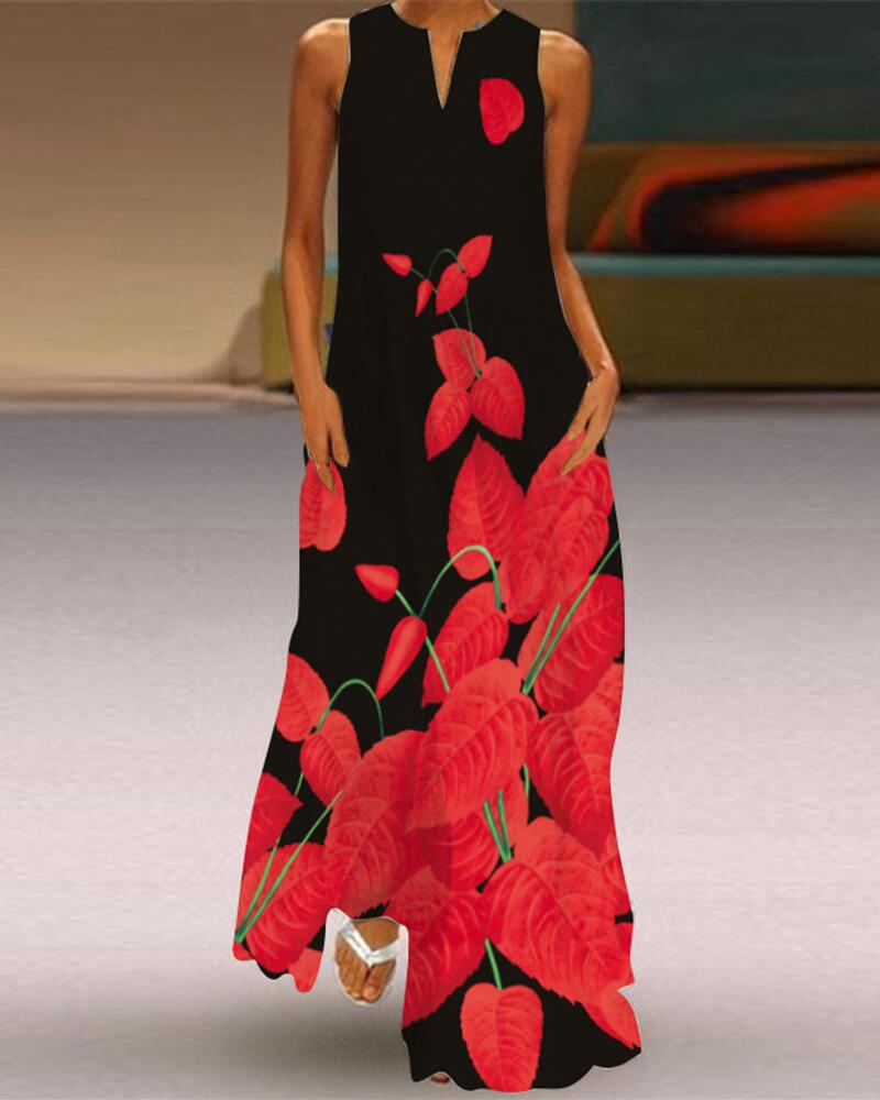 Style:Basics,Casual Type:Straight Material:Polyester Neckline:V-Cut Sleeve Style:Sleeveless Length:Maxi Pattern Type:Plants Fit Type:Regular Occasion:Daily,Vacation Package Include:1* Dress