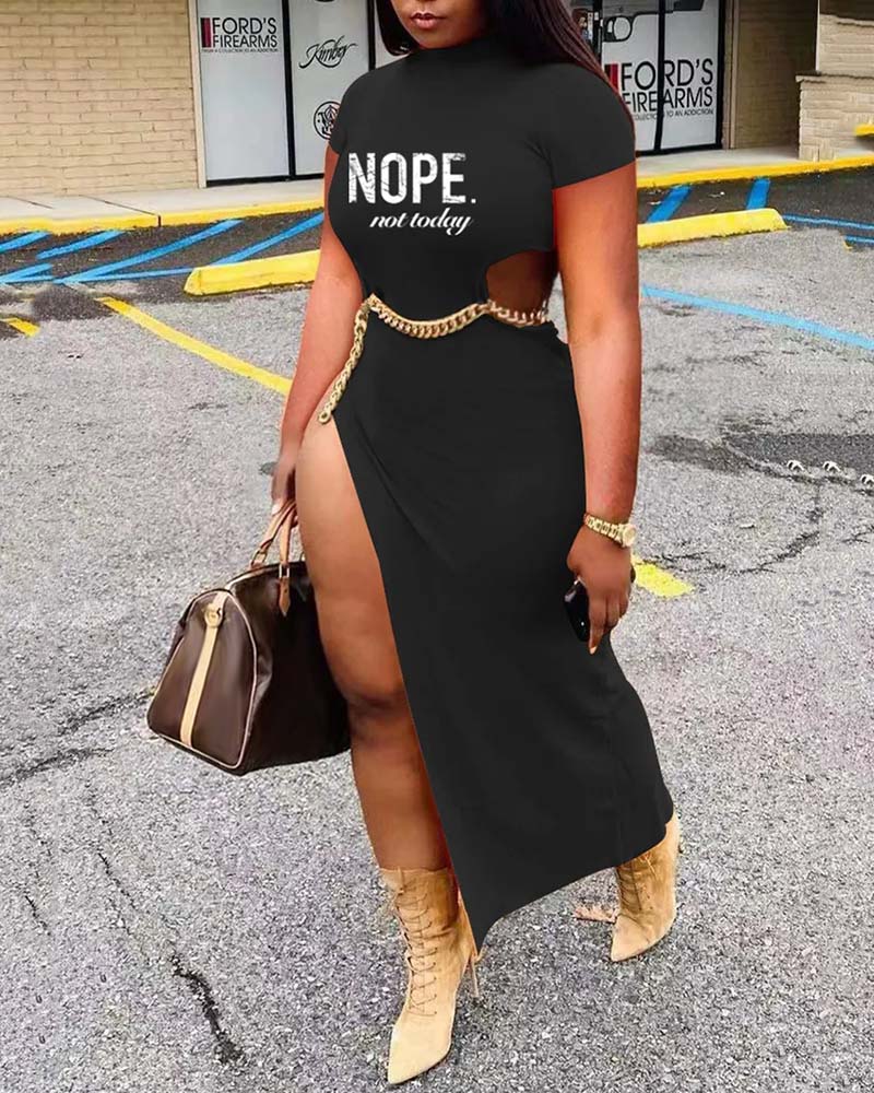 Style:Casual,Chic Type:Slit,Cutout Material:Polyester Neckline:O-neck Sleeve Style:Short Sleeve Length:Maxi Pattern Type:Letter Decoration:Chain,Cutout,Slit Fit Type:Regular Occasion:Daily Package Include:1* Dress
