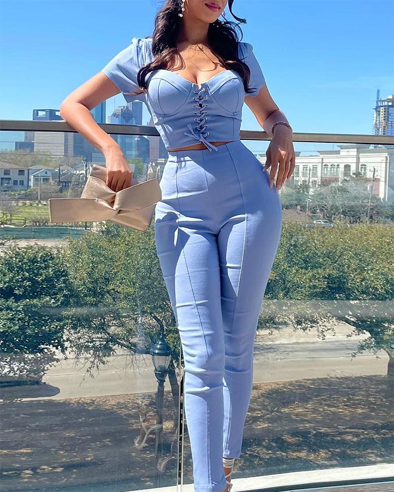 Style:Casual,Chic Type:Pants Sets Material:Polyester Neckline:V-Neck Sleeve Style:Short Sleeve Length:Long Pattern Type:Plain Decoration:Eyelet,Lace-up,Pastel Fit Type:Skinny Occasion:Daily Package Include:1* Pants Set