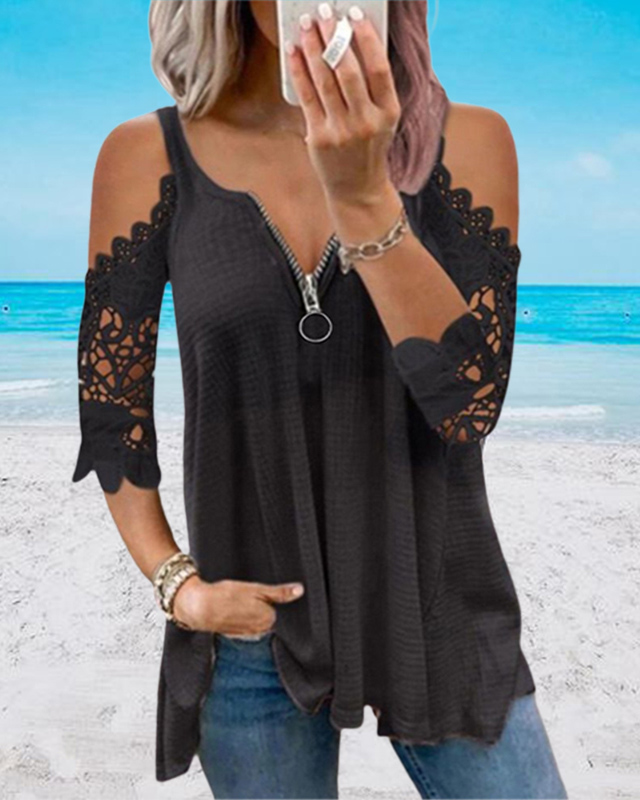 Style:Casual,Chic Type:Tee Material:Polyester Neckline:Cold Shoulder Sleeve Style:Half Sleeve Length:Regular Pattern Type:Plain Decoration:Contrast Lace,Zipper Fit Type:Regular Occasion:Daily Package Include:1*T-Shirt