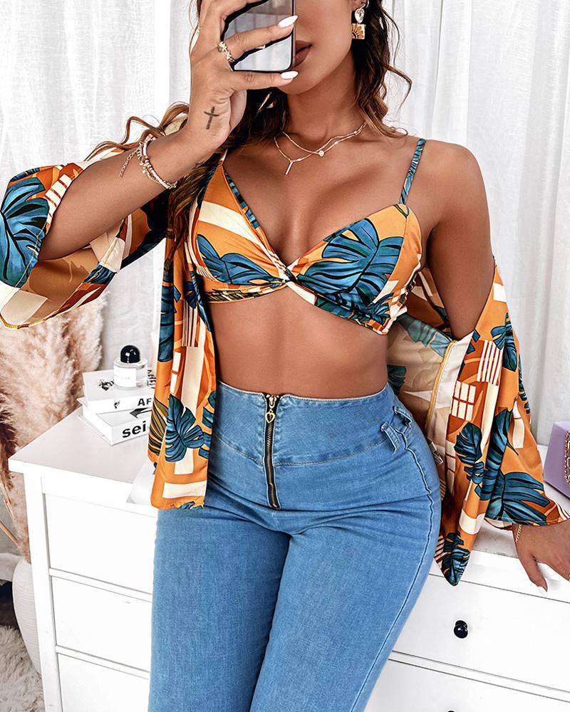 Tropical Print Twist Crop Cami Top & Blouse Set
